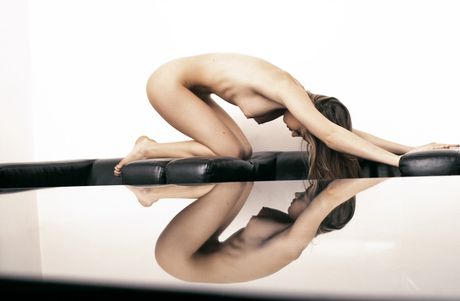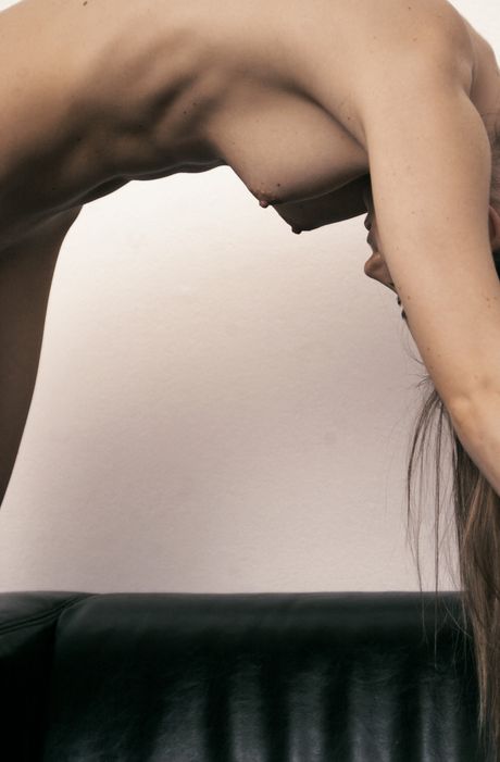 Delightful teen Kristi shows off her tiny tits and bald pussy in the nude