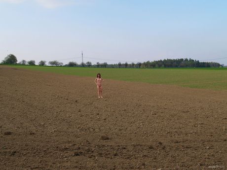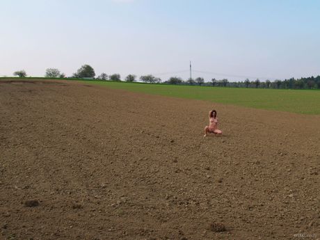 Hot babe Layla B models naked in the forest with bushy hair
