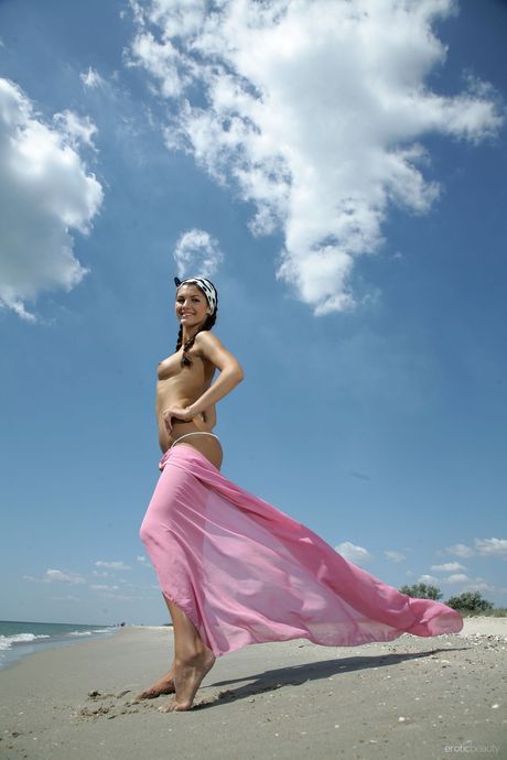 Innocent teen Lola B gets naked on a sandy beach in a pair of thong panties
