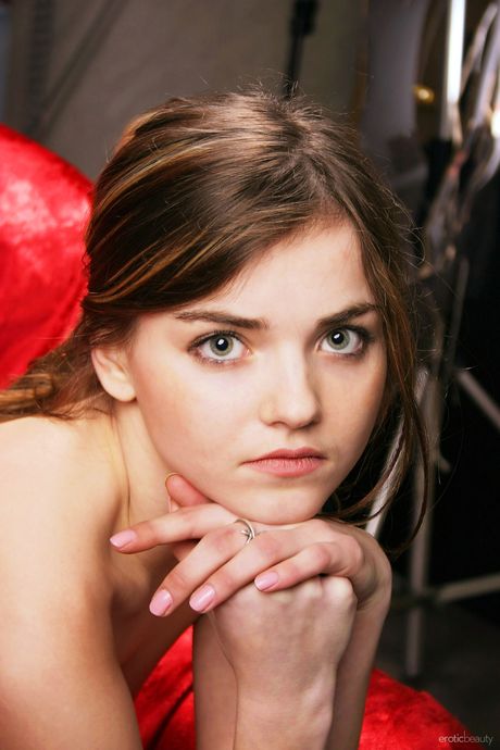 Lean teen Alice Kiss shows her tiny tits & poses nude on a red blanket
