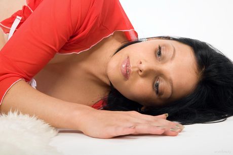 Lean teen Kim strips her black dress & shows her small tits & bald pussy
