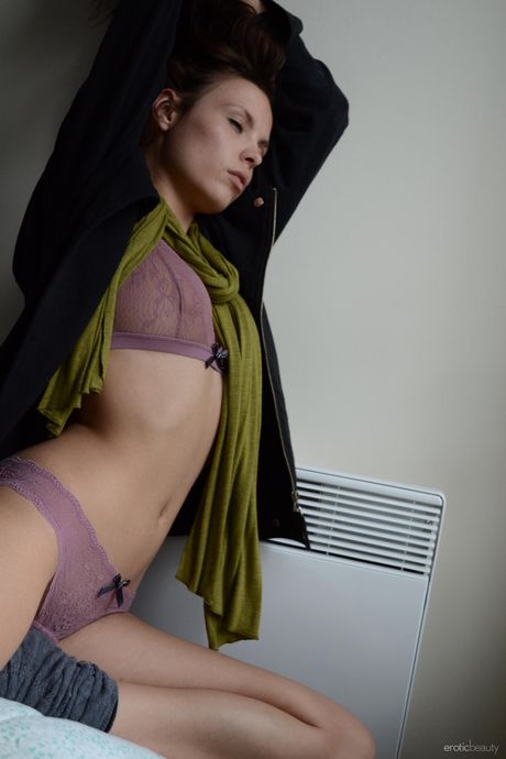 Petite teen Ginette gets naked in over the knee socks on a bed