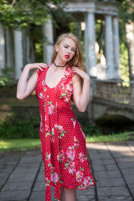 Redheaded teen Helene gets naked in a public park while wearing red lips