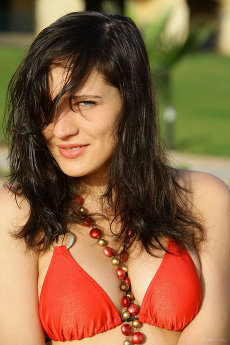 Saylor takes off her bikini and presents her sexy body and big tits outdoors