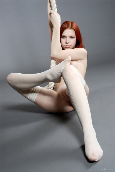Skinny redhead Augusta spreads her long legs to show her shaved pussy