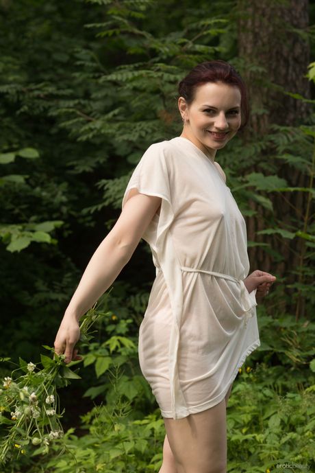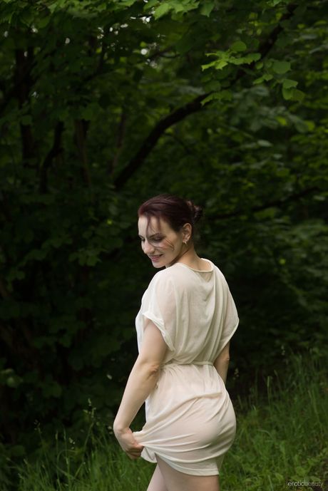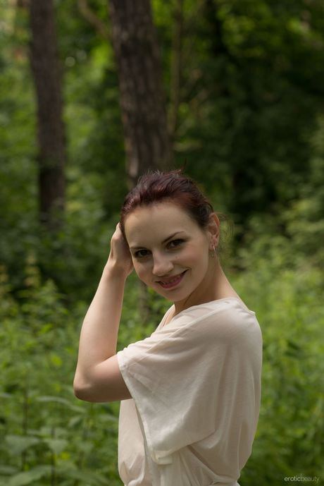 Skinny redhead Lisa Musa strips off her clothes near a pond and poses