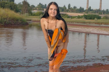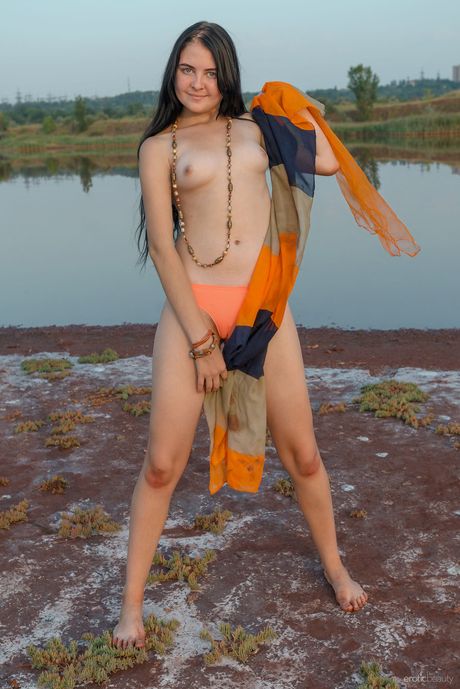 Slender teen Sonny Moor strips naked on a sandy beach in the sunset