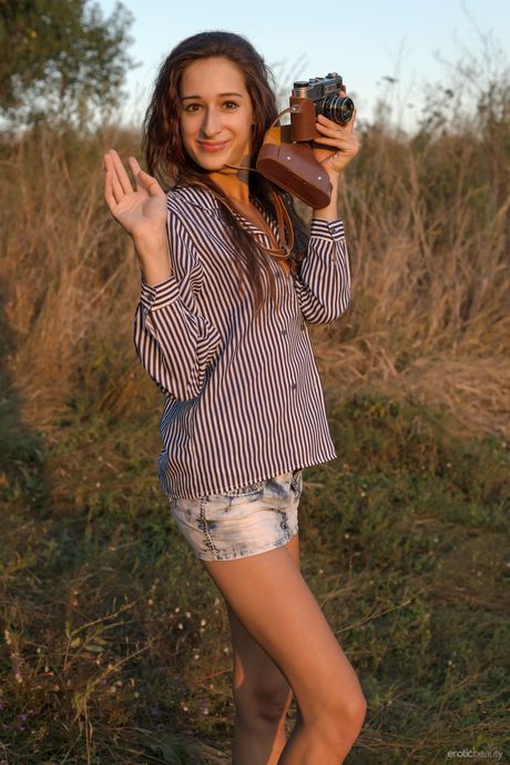 Slender teen Sugary poses nude outdoors and displays her tiny tits and pussy