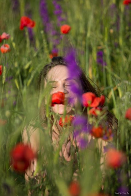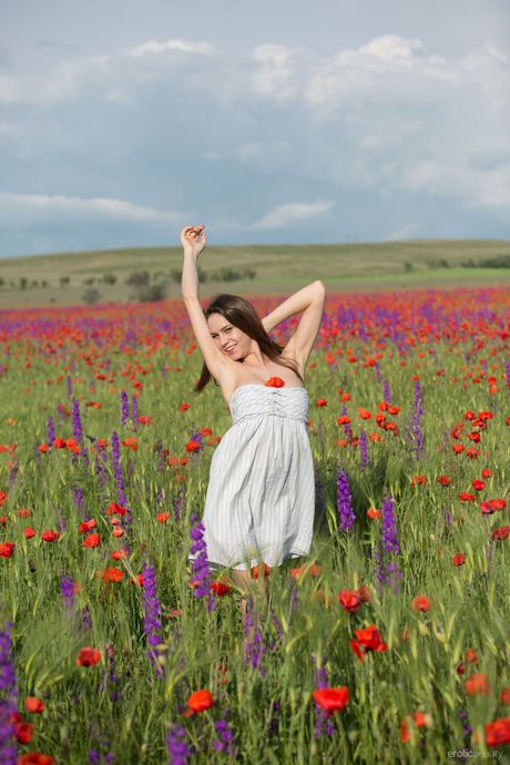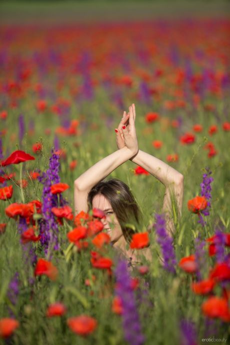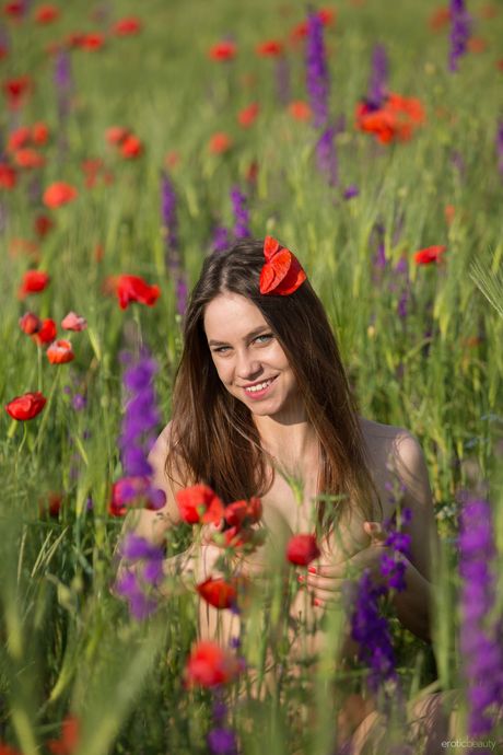 Slender teen with a beautiful face and a hot body poses naked in nature