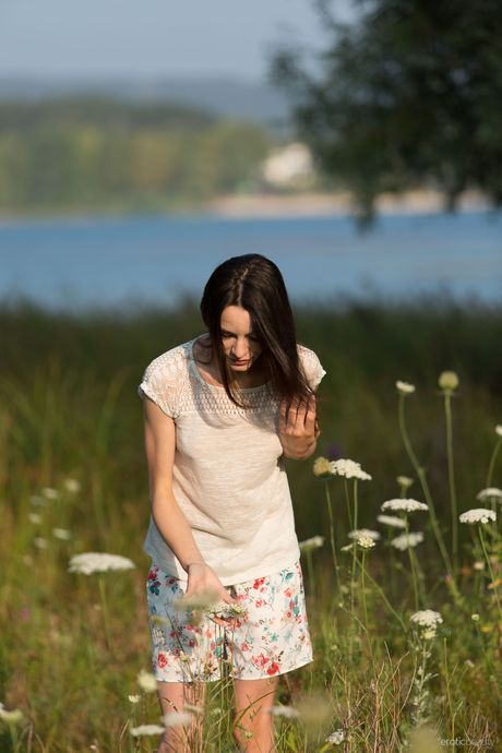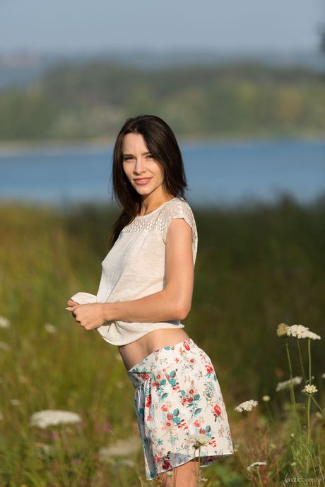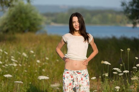 Svelte teen Adel Morel strips naked in a field and shows her hot body