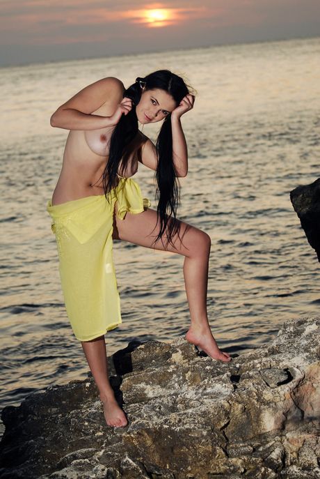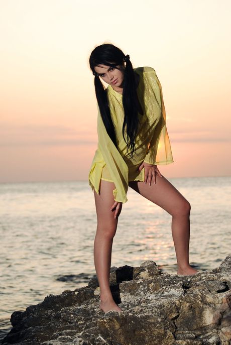 Svelte teen Janet B shows her tiny tits and shaved pussy in a solo