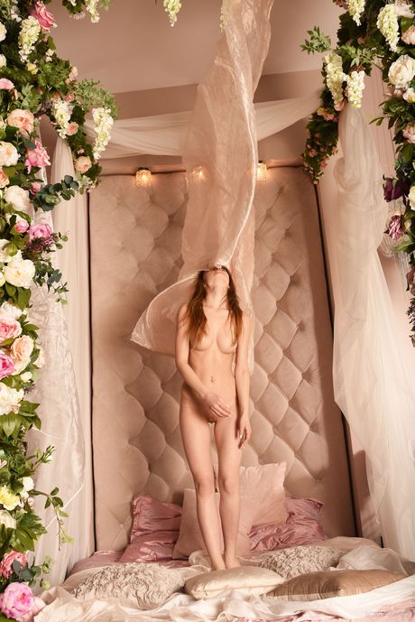 Thin teen Caramel strips naked & poses with a bouquet of red roses