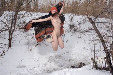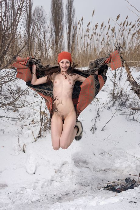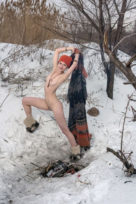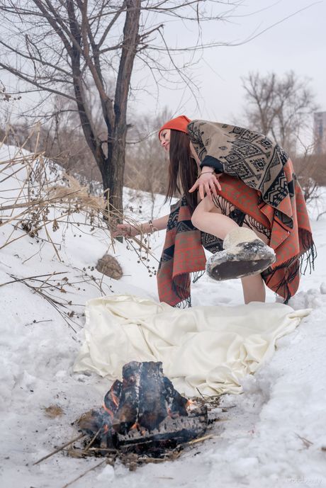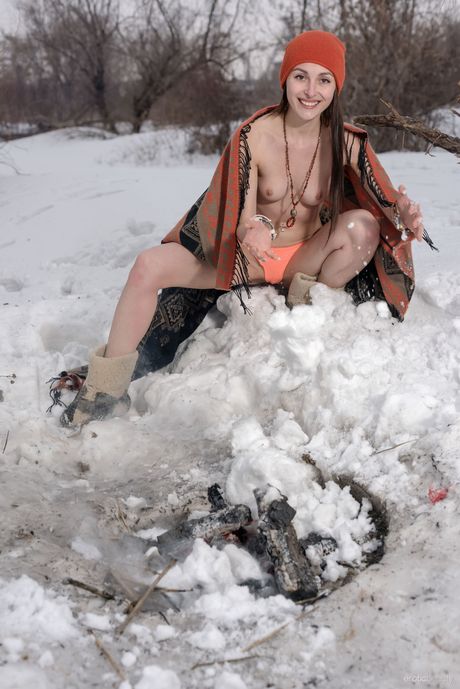 Thin teen Selin gets naked in a toque and boots by a fire in the snow