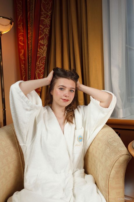 Ukrainian babe Elvera presents her big tits and shaved pussy in stockings
