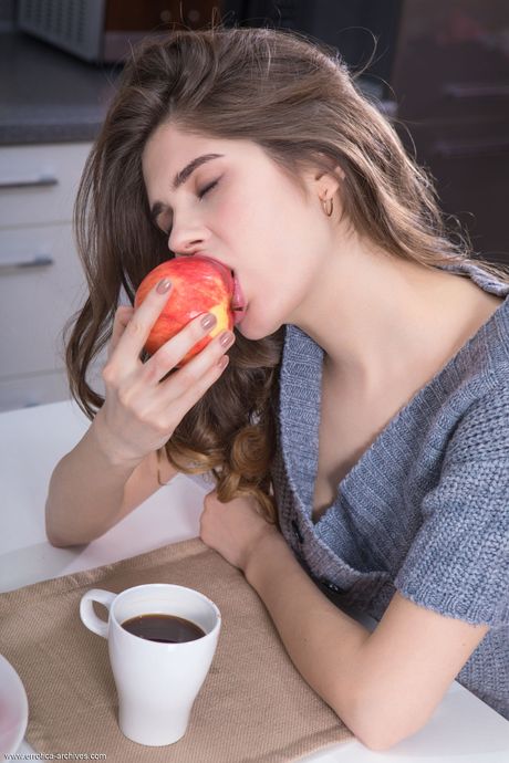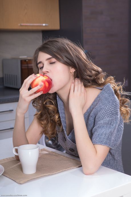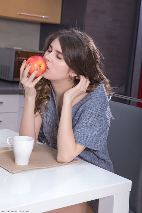 Angelic teen Luna Pica gets naked on the kitchen table while eating an apple
