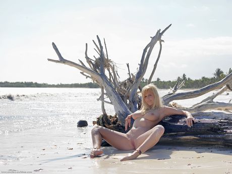 Blonde teen Keira gets naked on a sandy beach in the water