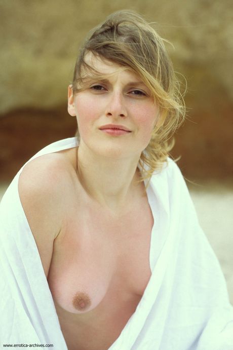 Blonde teen Lenna poses nude and presents her tits on the beach