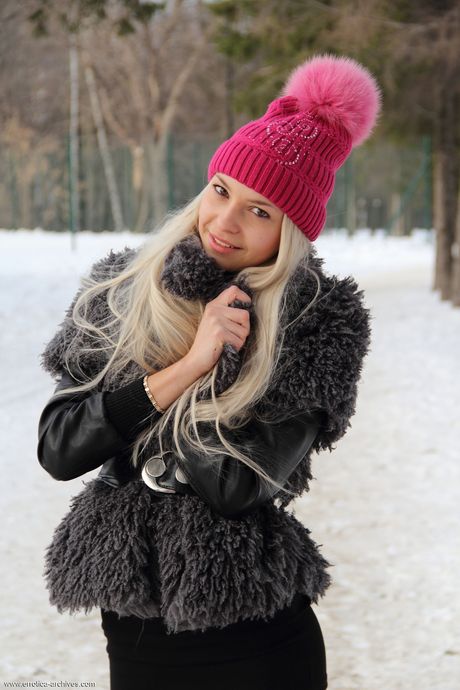 Blonde teen Leonie gets naked in heels on a patio in a sexy manner