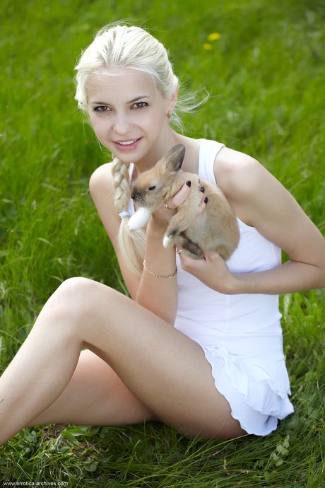 Blonde teen Leonie gets naked on a patch of grass boldly