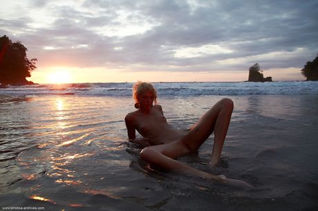 Blonde teen Lilly poses totally naked on a sandy beach