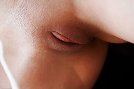 Blonde teen Oliana models totally naked on a patio chair in the sun