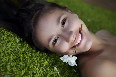 Brunette babe Vicky revealing small teen tits and shaved pussy during glamour shoot