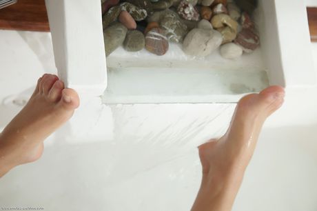 Brunette teen Anastasia removes her bathrobe to get naked in a bathtub