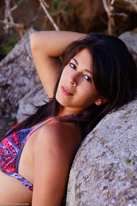 Dark haired teen Daisy B strips off her bikini to pose nude in the forest