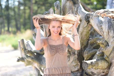 Delicate teen Maxa bares it all on a fallen tree in a rural setting