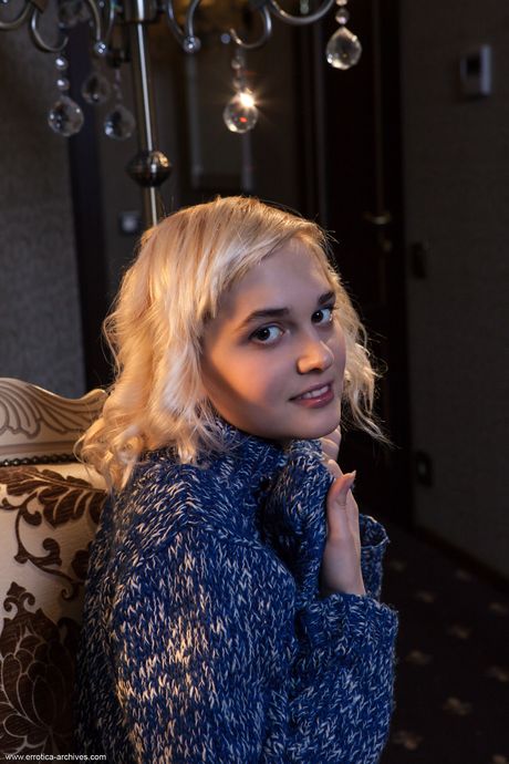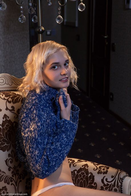 Delightful teen Loren removes her thong to show her tiny tits and shaved pussy