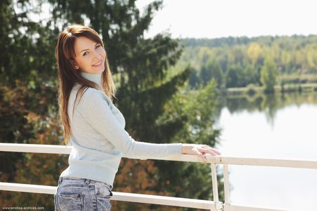 Engaging teen Anna Violete shows her tiny tits and bald pussy in the nude