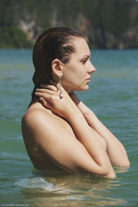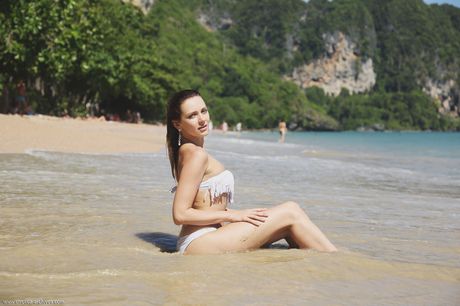 Glamour model Oliana removes her bikini to pose nude on a beach