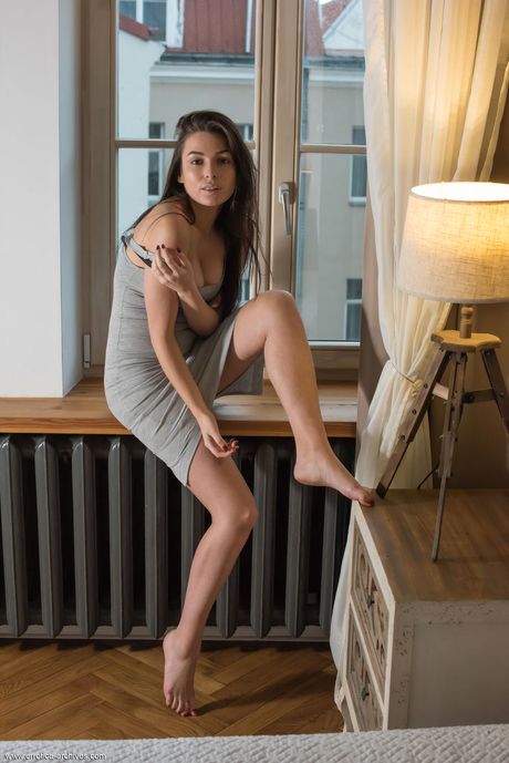 Lean teen Marina R removes her lingerie and highlights her tiny tits and twat