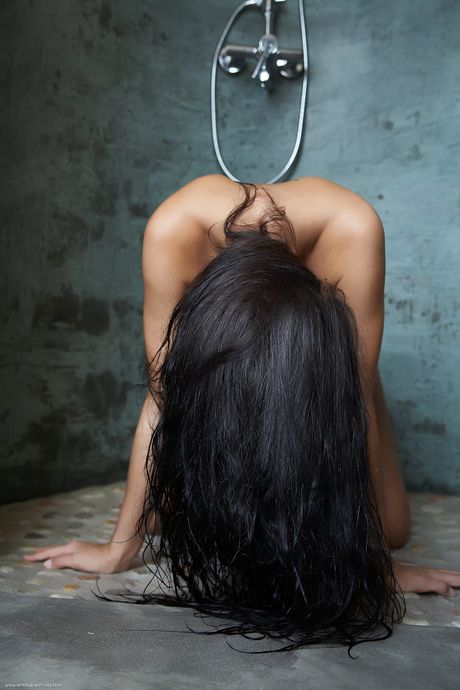 Petite teen Hene takes a shower after a day of nude sunbathing
