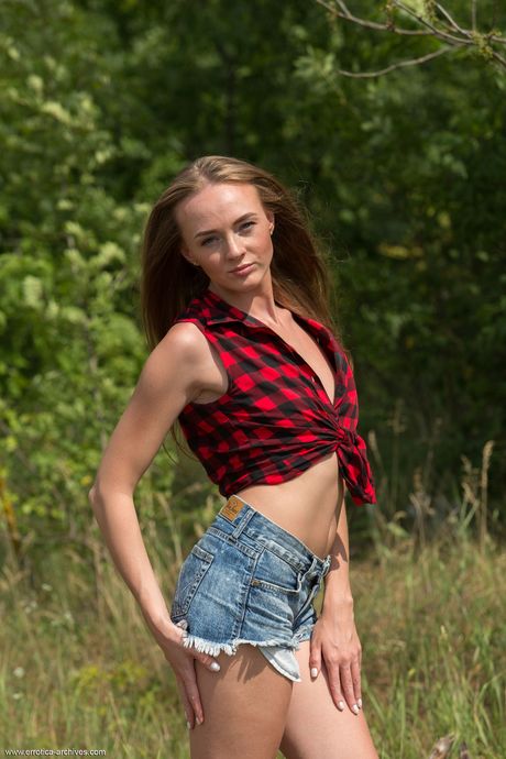 Slender teen Andrea Sixth gets totally naked on a log in a plaid shirt