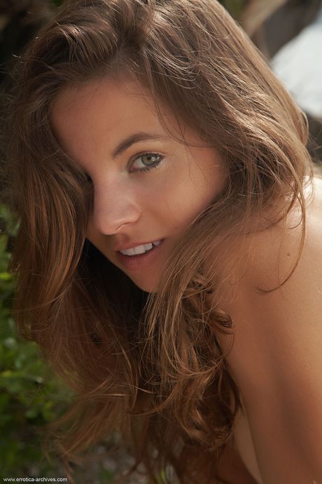 Slender teen Antea displays her yummy pussy on a rock beach in just a belt