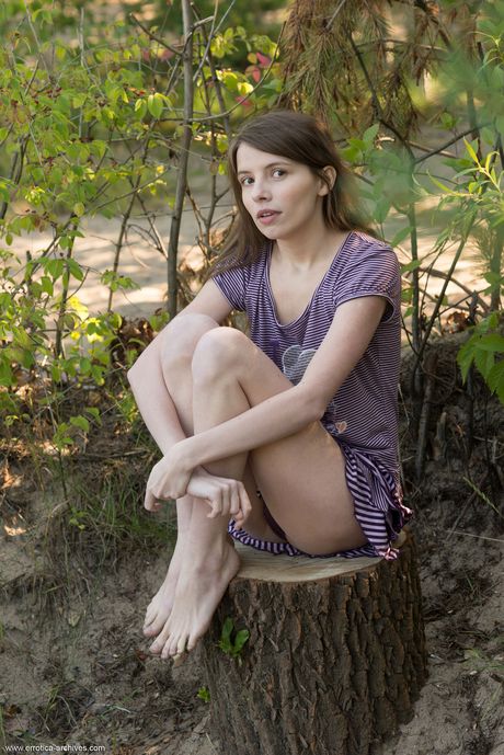 Slender teen Jemma A strips naked in a backyard before posing on a tree