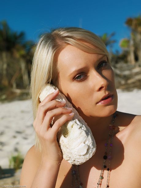 Solo girl with long hair and a great body poses nude on a sandy beach