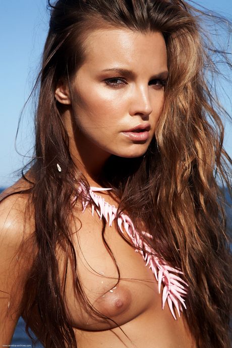Tall teen Carina poses totally naked on a sandy beach in the water