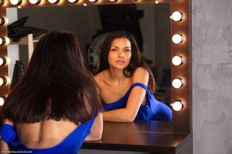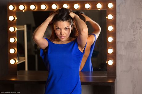 Teen model Isha removes a black dress to pose nude in stockings by herself