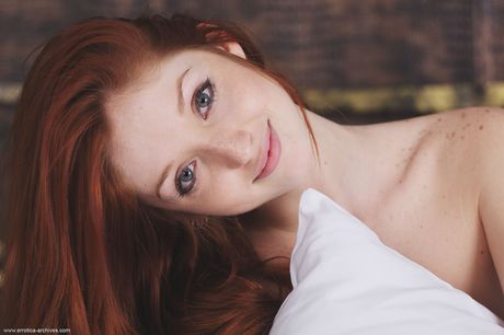 Young redhead Micca highlights her bald pussy while naked on her bed