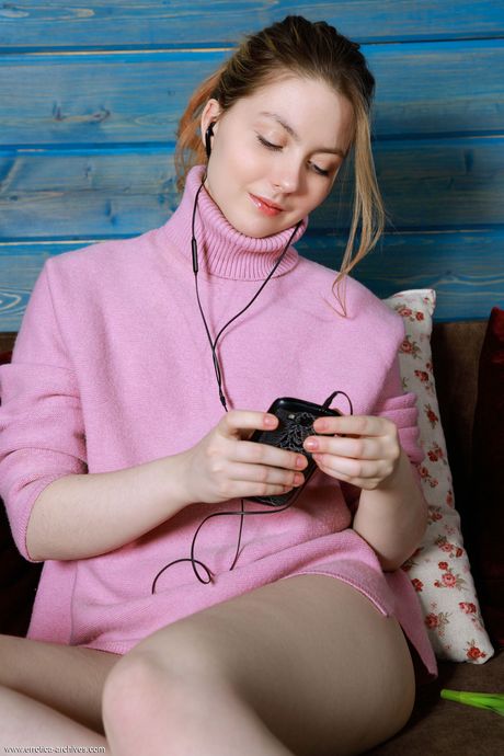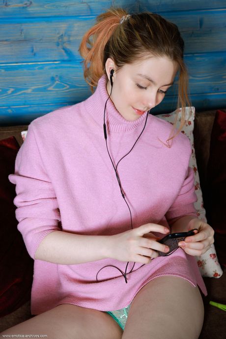 Young redhead Rita confidently displays her trimmed vagina in the nude