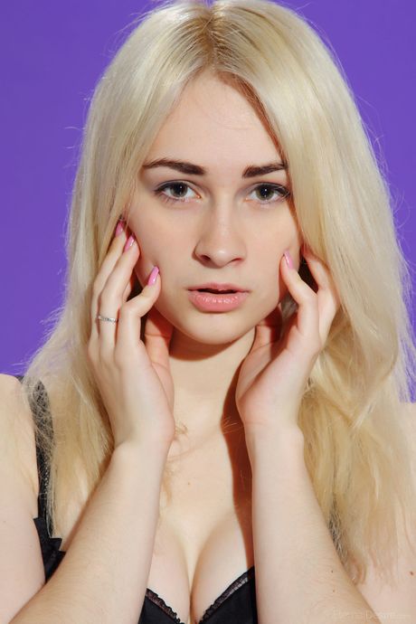 Angelic teen Tia N removes black lingerie and heels to pose nude in a kitchen