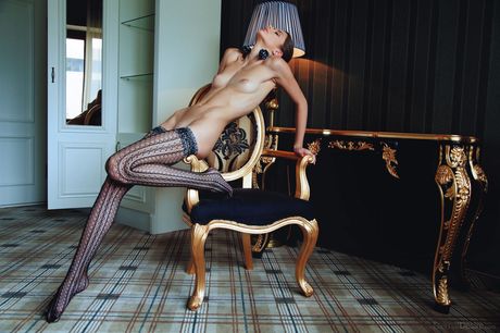 Delicate teen Loretta A shows her tiny tits and poses in stockings