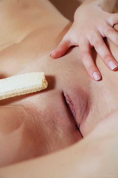 Lean teen Colleen A eats a banana while getting naked in a kitchen