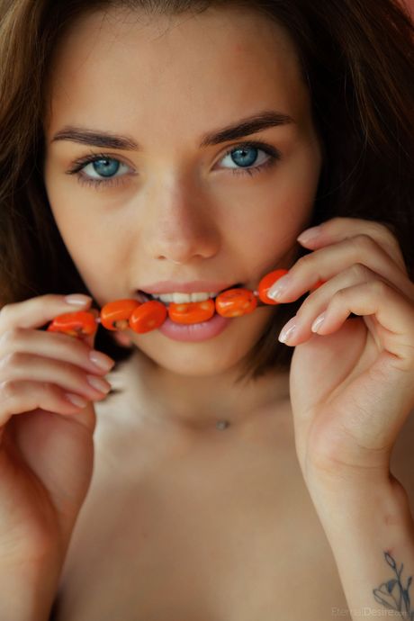 Naked teen Keira B shows her trimmed pussy and small tits on a chair
