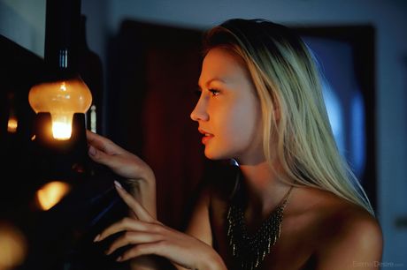 Skinny teen Katrina shows her small tits and poses nude on a hutch
