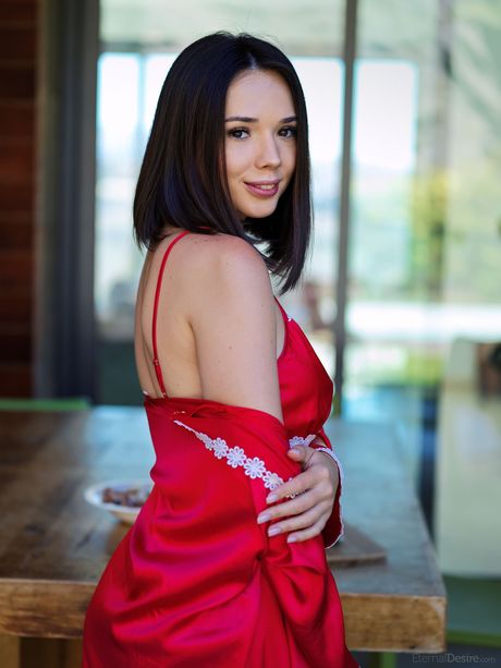 Young brunette Eve Sweet slices open a tomato before getting totally naked