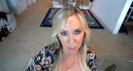 Excellent american blonde wife Sandra Otterson take in mouth cock and gets a cum blast on face