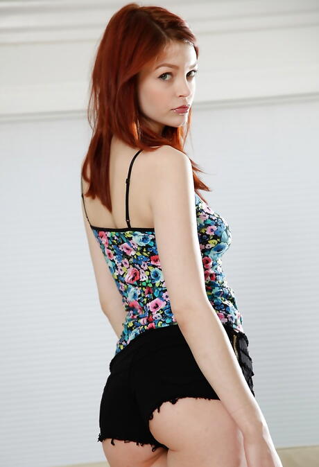 Excellent american redhead Bree Daniels in shorts exposes big knockers and hairy pussy